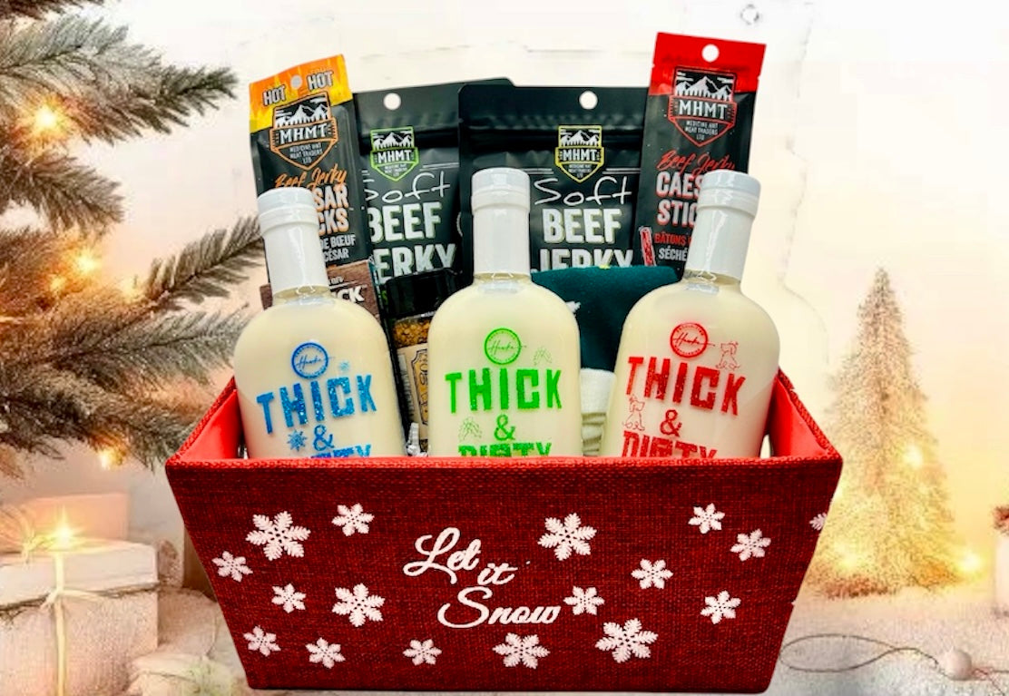 Our curated gift basket for the man on your list. We have put together a basket filled with 3 mini bottles of Thick & Dirty holiday flavours (Hawkelnoggle, Winter Truffle & Peppermint Bark) plus local finds from The Makers Keep vendors.