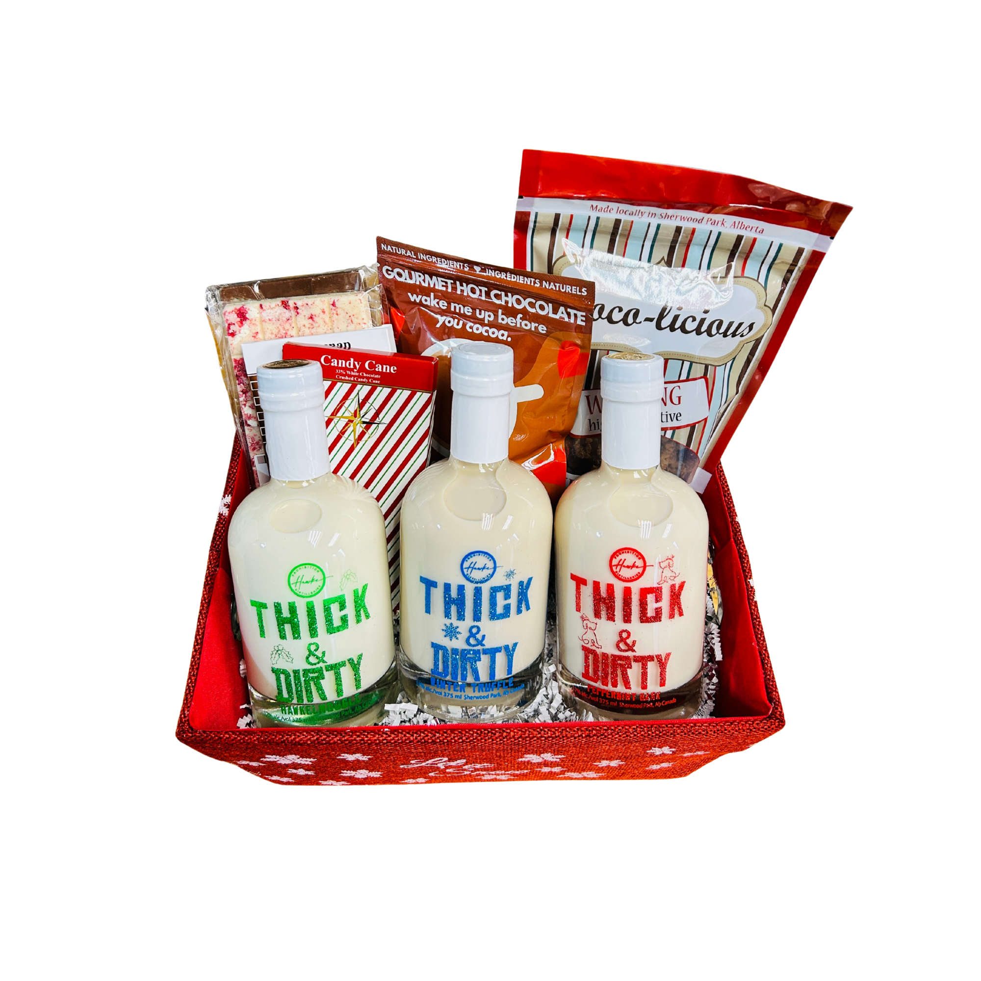 Our curated gift basket for the chocolate lover on your list. We have put together a basket filled with 3 mini bottles of Thick & Dirty holiday flavours (Hawkelnoggle, Winter Truffle & Peppermint Bark) plus treats from The Makers Keep vendors.